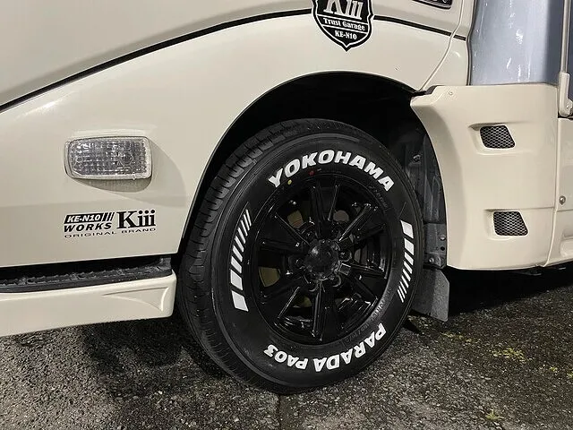 少し前にご紹介しました大阪府のM様のキャンピングカーがタイヤ交換に来てくれました。いつもありがとうございます。元々は無地の普通のタイヤでしたが、ホワイトレターの入ったヨコハマのPARADAに交換しました。ホワイトレターが入るだけでガラッとイメージが変わりますね。一段とかっこよくなりました。ステッカーも前より色々と増えていてカスタムも楽しんでいるみたいです。K3では軽自動車からハイエースはもちろんこのようなキャンピングカーもタイヤ交換できますので是非是非お問い合わせよろしくお願いします
