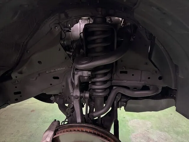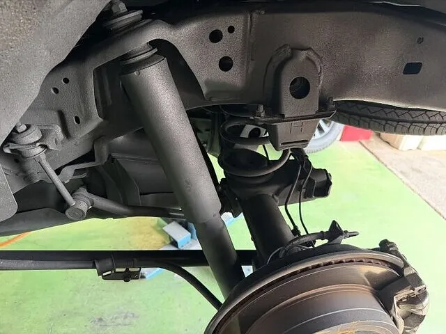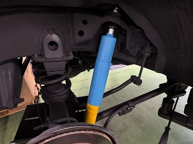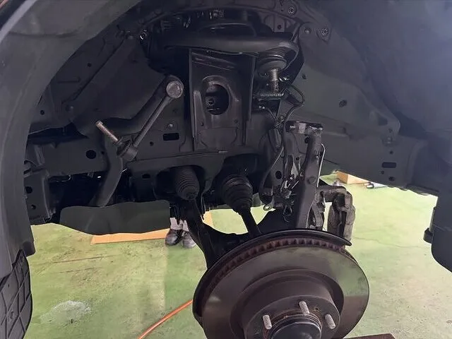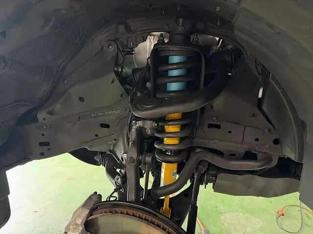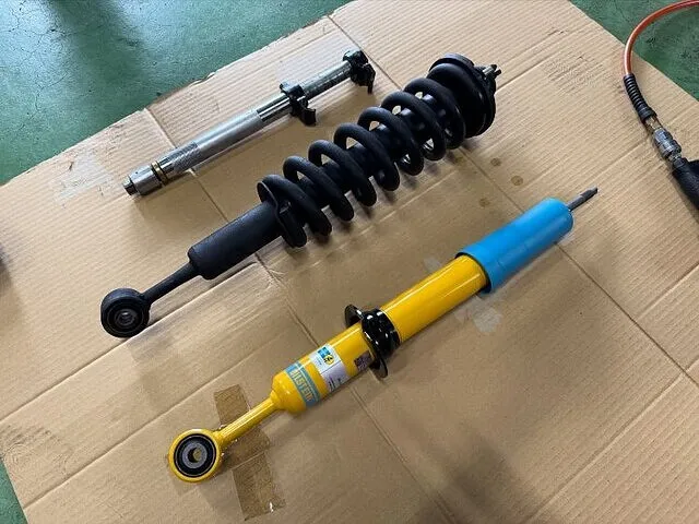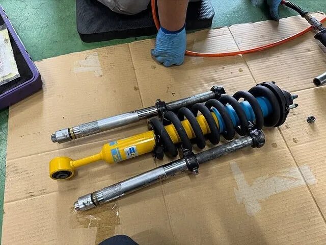 フロントは少し外すのが大変で…そのままでは絶対外れないのでスタビリンクやアッパーアームなどなど…色々外してやっとサスが外れます。あとはスプリングコンプレッサーを使ってバネをビルシュタインに組み替えていきます。組み換えが終わったらサスを取り付けてアッパーアームなど外したものを元通りに組んでいきます。最後に軽くアライメントを確認して作業完了になります。