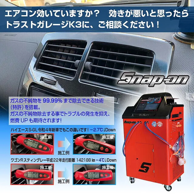 今日は先日に導入致しましたスナップオンのクーラーガスクリーニングの機械のご紹介です。スナップオン 2ガス対応 カーエアコンサービスステーションというもので、従来のガスのHFC-134aはもちろんのこと、最近の新車に導入されつつある新ガスのHFO-1234yfにも対応したモデルの機械になります。ガソリン車、ハイブリッド車にも対応しているのでほぼほぼのお車に施工可能になってます。更にガスの不純物を99.99%まで除去できる技術(特許)を搭載して、世界最高レベルの高純度ガス再生機能なので性能も文句無しです。クーラーガスクリーニングのメリットメリット①ガスの水分や不純物を取り除くことができます、水分や不純物が混ざっていては、エアコンガス本来の性能を発揮できず、エアコンの効きが悪くなることがあります、エアコンガスクリーニングではガスを一度全て抜いて、特殊なフィルターでガスを綺麗にします。メリット②真空引きでガス漏れのチェックができます。もし部品の経年劣化などが原因でガスが漏れている場合、その原因を解消しなくてはせっかくガスを補充しても意味がありませんのでエアコンガスクリーニングでは、真空引きの際にガス漏れのチェックを同時に行います。メリット③ガスを適正量まで正確に充填できます。ガスは適正量でなければ性能をフルに発揮することができないため、多すぎても少なすぎてもいけません。エアコンガスクリーニングなら、ガスを一旦全部抜き、クリーニングと真空引きをした後に、機械が適正量まで正確にガスを充填します。この様にクーラーガスクリーニングをするとお車のクーラーの状態も分かりますので故障する前に予防修理なども可能となってますよ車のオイル交換同様、クーラーガスも定期的に綺麗にしておけば故障するリスクも減らせます。さらにさらに、クーラーガス添加剤のワコーズのパワーエアコンプラスを同時に施工してあげると…個体差はありますが、さらに冷えますよこちらもトラストガレージK3で取扱がありますので施工可能になります。是非是非お問い合わせ、ご来店お待ちしております。