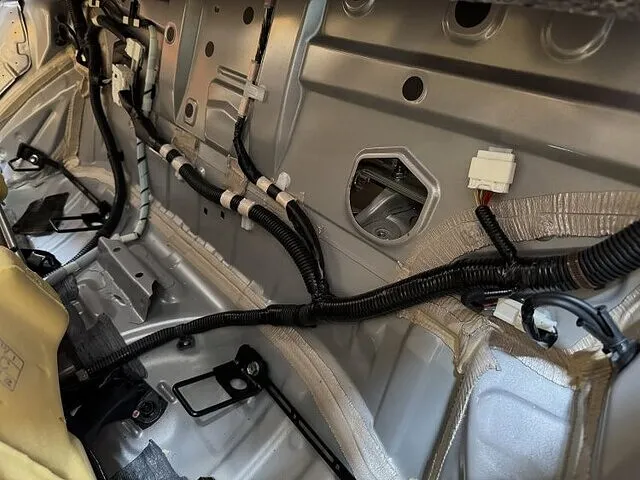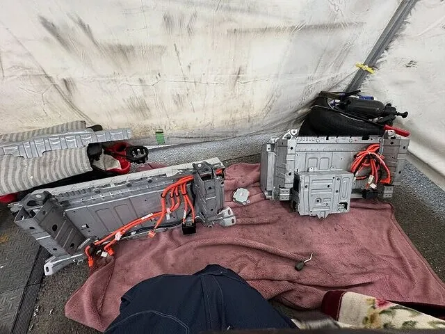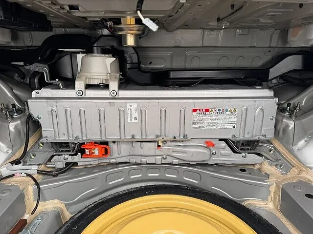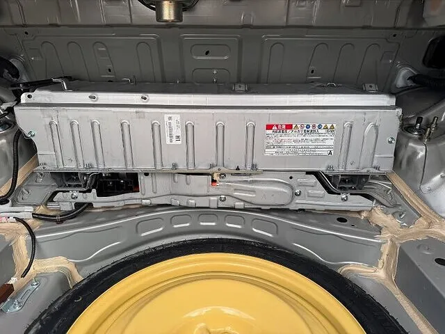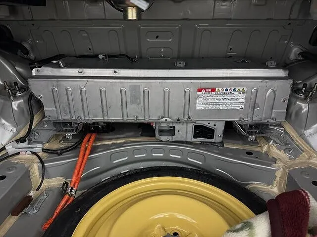 そこからハイブリッドバッテリーの上にある冷却用のファンやダクトを外していき、バッテリーの電気遮断用のプラグなどを外していきます。配線などがあらかた外れたら固定しているボルトとナットをトランク側と車内側から5個外します。車内側はリアシートの背もたれの裏にあるのでもちろんリアシートもバラします。固定ボルト、ナットが外れたら2人がかりで降ろします。これがまた狭いし重い、傷が付かないように慎重に降ろせたら載せ替えるバッテリーに移植しないといけないものを移していきます。それが終わりましたらまた2人がかりで積み込んでいきます。積むのもこれまた大変。位置をしっかり確認してきっちり載せたら固定して元に戻していきます。内装を外しているついでに補機バッテリーも交換をお願いされましたので交換致しました。